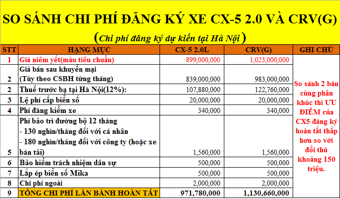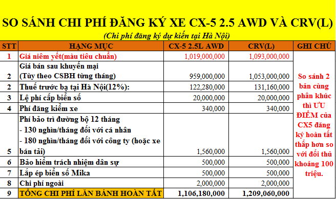 Để so sánh về ngoại – nội thất hay tính năng của Mazda CX-5 và Honda CRV thì khách hàng vẫn cảm thấy khó chó thể chọn lựa. Vậy nếu xét về giá cả liệu cuộc chiến này có đi đến hồi kết? Hãy theo dõi bảng so sánh chi phí chi tiết các phiên bản của hai dòng xe này dưới đây: