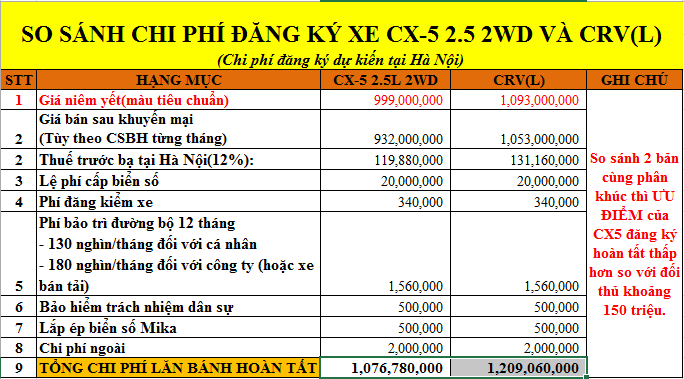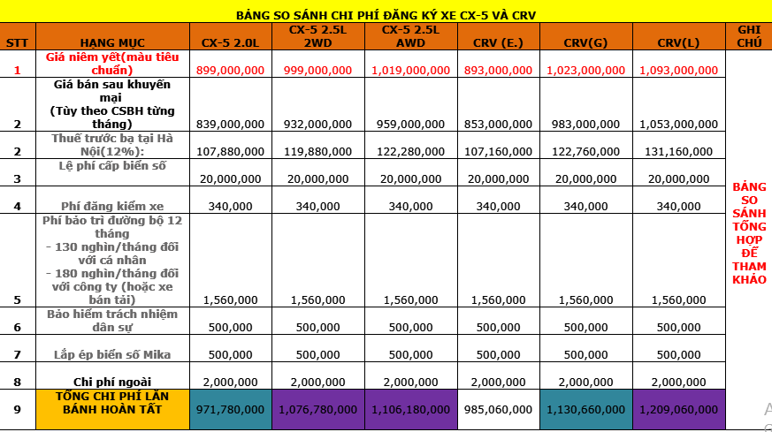 Như vậy qua 3 bảng so sánh cả 3 phiên bản của Mazda CX-5 và Honda CR-V, bạn có thể nhìn thấy rõ nhất sự chênh lệch về giá ở bảng tổng hợp dưới đây: