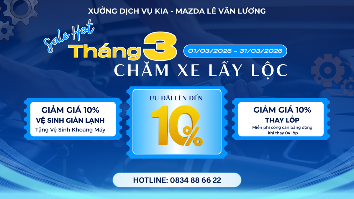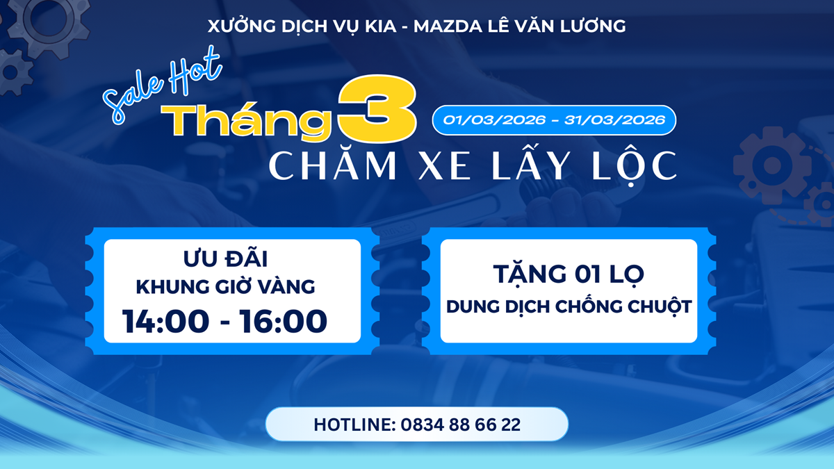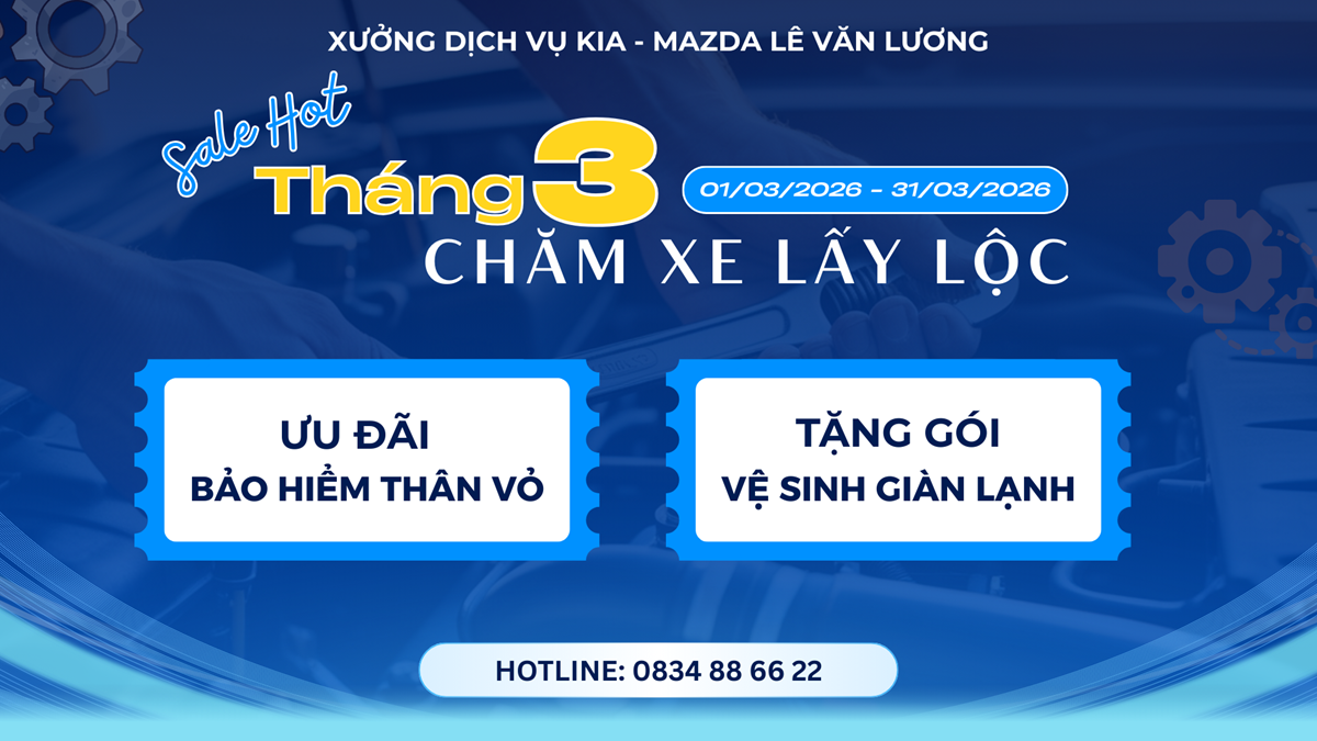 Nhằm đáp ứng nhu cầu đó, Xưởng Dịch vụ Kia Mazda Lê Văn Lương triển khai chương trình ưu đãi bảo dưỡng tháng 3/2026 với nhiều quyền lợi hấp dẫn dành cho khách hàng.