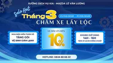 Tháng 3 – Xưởng Dịch vụ Kia - Mazda Lê Văn Lương gửi tới Quý khách hàng chương trình KHUYẾN MẠI ĐẶC BIỆT với hàng loạt ưu đãi về đồng sơn, sửa chữa, chăm sóc – làm đẹp xe.